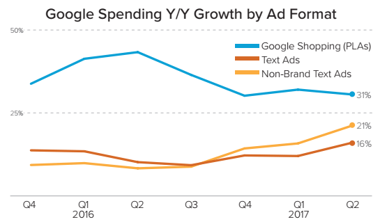 En los anuncios de texto que no son de marca, el gasto aumentó un 21 por ciento año tras año en el segundo trimestre. A modo de comparación, el año pasado, la inversión en anuncios de texto que no son de marca aumentó solo un 8 por ciento año tras año.