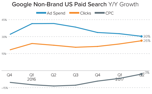 En general, el gasto en búsquedas de Google aumentó un 23 por ciento interanual en el segundo trimestre de 2017, lo que representa una tasa de crecimiento más rápida que la que vio la compañía en el primer trimestre, cuando la cifra anual fue del 21 por ciento. Los clics aumentaron un 18% con respecto al mismo período del año anterior y los CPC se mantuvieron planos.